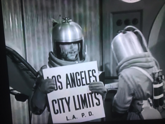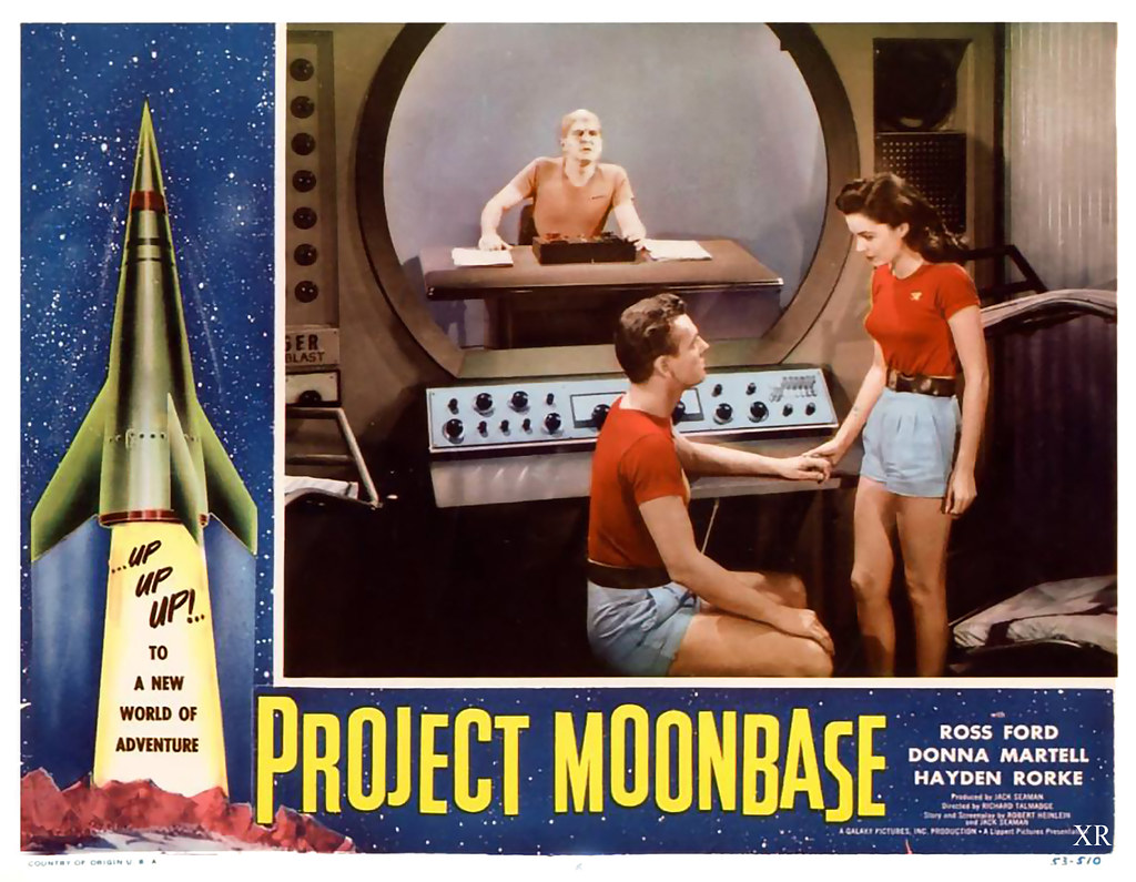 It is reported that Cat-Women used the same costumes and sets as the disappointing but interesting Project Moonbase (1953) and some may spot that a couple of the space-suits – they don’t all match – are from Destination Moon (1950). Project Moonbase was based on a screenplay by Robert A. Heinlein (1907-88 in sleep from emphysema and heart failure) who is regarded as one of the fathers of modern science fiction writing. It was his only Hollywood screenplay and he was known for his creation of strong female characters which were inspired in part by his later life partner Virginia Gerstenfeld (1916-2003). Marie Windsor is one such strong woman in her only sci-fi appearance and Heinlein, who wrote the novella The Man who Sold the Moon in the late 1940s, is given homage in Cat-Women by the appearance of a sign which reads that the moon will be sold as a part of Los Angeles real estate. Project Moonbase sees a future with women in positions of authority and in that sense its futurist predictions have almost come true but the film is no classic.
