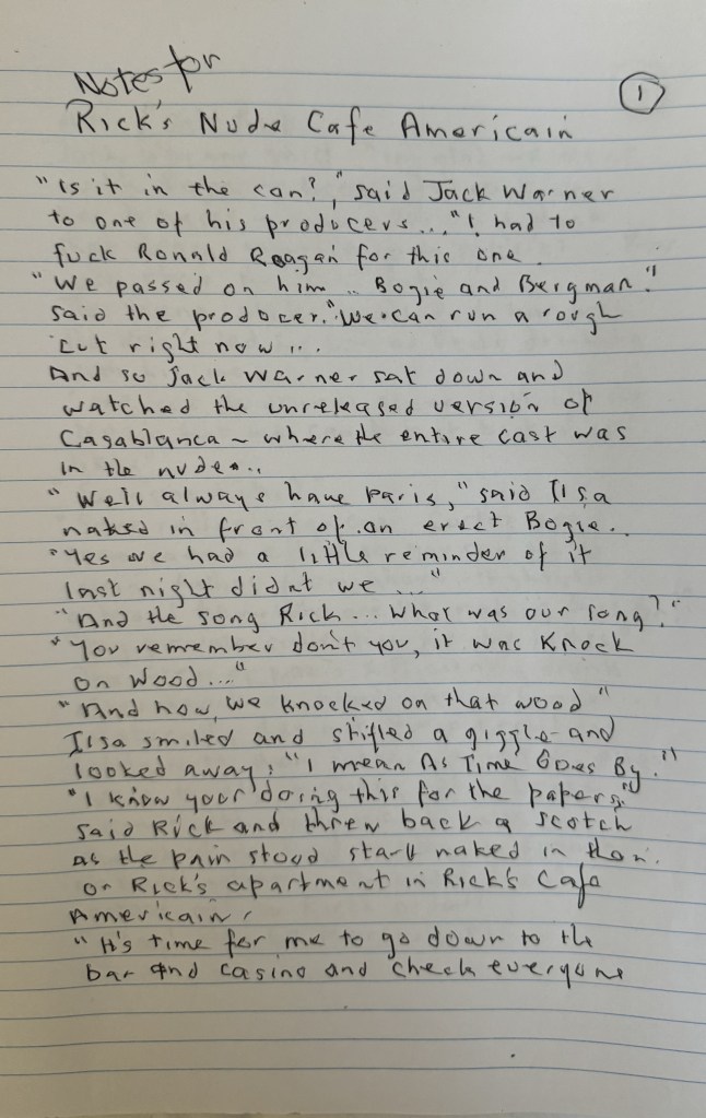 Short Story: Rick’s Nude Cafe Americain cultfilmalley September 29, 2024 0 The written word comes in many forms and this short story has been hand-written by Jason Quirk and published straight from his notebook. Rate this:Like Loading... Related